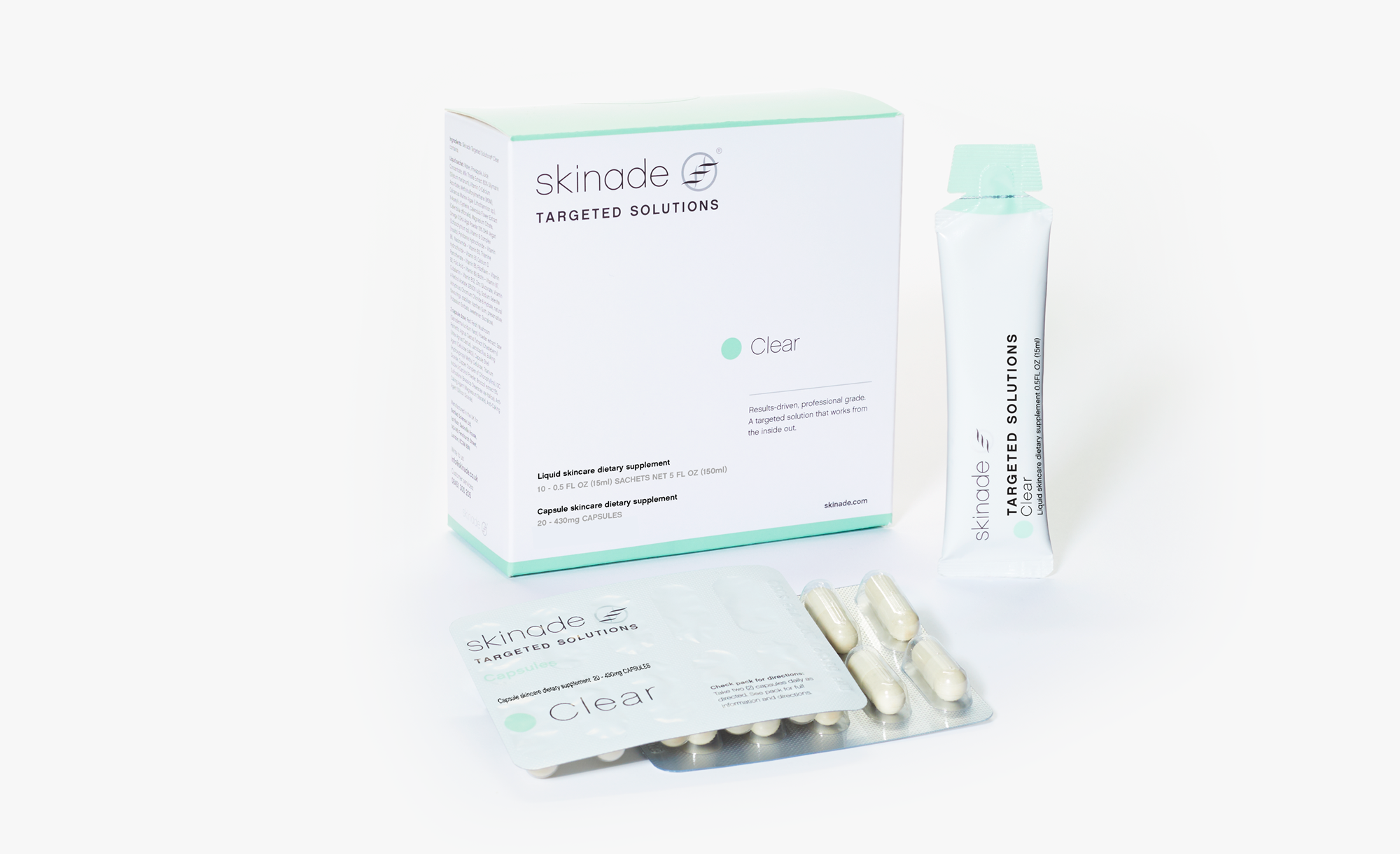 Skinade Targeted Solutions® Clear is an internal skincare product that delivers its functional ingredients in a two-step approach. A drinkable highly absorbable liquid sachet component and a slow delivery capsule component. This two-step delivery mechanism ensures optimal efficacy. As the product works from the inside, it supports the skin all over the body (whether you have blemishes on your face, back, chest or neck).