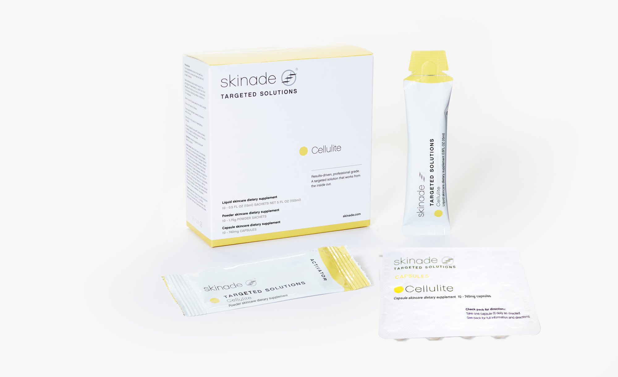 Skinade Targeted Solutions® Cellulite Comes in three parts; a liquid sachet, a special powder activator sachet and a capsule component.